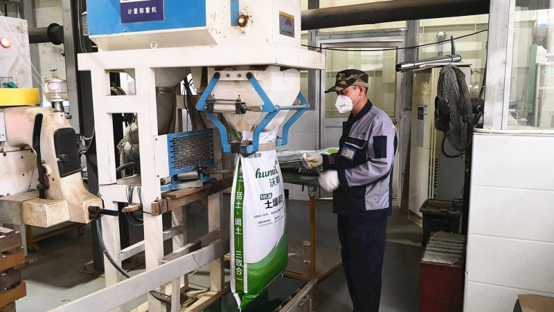 濕垃圾廠(chǎng)的工人打包土壤調(diào)節(jié)劑