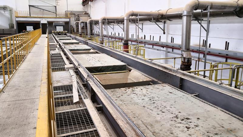 生化處理機(jī)上方,圖中遠(yuǎn)處的卸料斗會(huì)根據(jù)電腦指令,通過(guò)軌道滑行到目標(biāo)漏斗,將裝好的濕垃圾倒入漏斗下方的生化處理機(jī)
