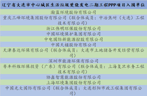 2018年11月6日,該項(xiàng)目啟動(dòng)資格預(yù)審,11月30日,項(xiàng)目發(fā)布資格預(yù)審結(jié)果,瀚藍(lán)環(huán)境、三峰環(huán)境、中國(guó)環(huán)保、粵豐環(huán)保、上海環(huán)境、光大國(guó)際等在內(nèi)的12大名企集體入圍,具體名單如下: