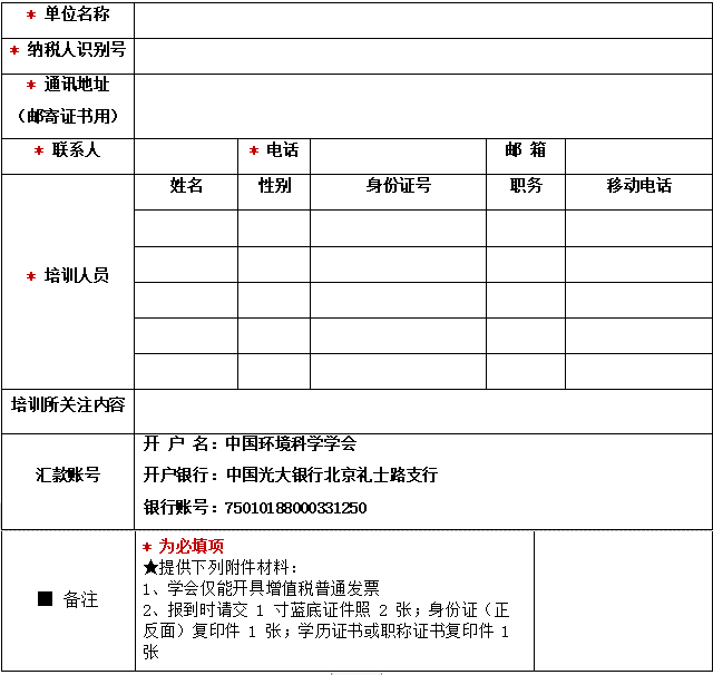 1、培訓(xùn)費(fèi)用:培訓(xùn)班收費(fèi) 3800元/每人,包括培訓(xùn)費(fèi)、資料費(fèi)、證書(shū)費(fèi)等。由中國(guó)環(huán)境科學(xué)學(xué)會(huì)收取培訓(xùn)費(fèi)并開(kāi)具發(fā)票(一律開(kāi)具增值稅普通發(fā)票),請(qǐng)?jiān)趨R款時(shí)備注“環(huán)境修復(fù)項(xiàng)目經(jīng)理”培訓(xùn)費(fèi)用(參加培訓(xùn)人員姓名),多位人員參加則在括號(hào)內(nèi)逐一填寫(xiě)參加人員姓名,例:環(huán)境修復(fù)項(xiàng)目經(jīng)理培訓(xùn)費(fèi)(小明/小華/小雷)。住宿可統(tǒng)一安排,費(fèi)用自理。