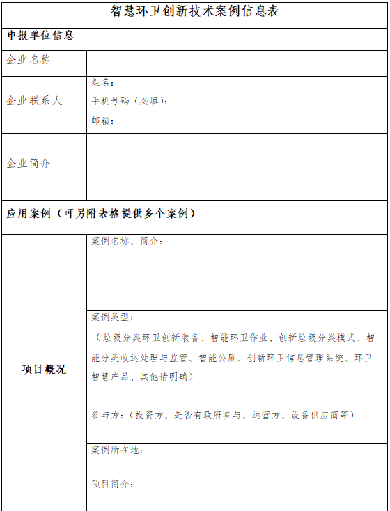 智慧環(huán)衛(wèi)是智慧城市的一個(gè)重要組成部分,智慧城市的建設(shè)迫切需要智慧環(huán)衛(wèi)的提升。在此背景下,中國環(huán)聯(lián)擬面向行業(yè)征集“智慧環(huán)衛(wèi)創(chuàng)新技術(shù)案例”,征集范圍包括垃圾分類環(huán)衛(wèi)創(chuàng)新裝備、智能環(huán)衛(wèi)作業(yè)、創(chuàng)新垃圾分類模式、智能分類收運(yùn)處理與監(jiān)管、智能公廁、創(chuàng)新環(huán)衛(wèi)信息管理系統(tǒng)、環(huán)衛(wèi)智慧產(chǎn)品等的環(huán)衛(wèi)相關(guān)落地應(yīng)用項(xiàng)目案例。請(qǐng)有意向的企業(yè)按附件填寫申報(bào)表,并發(fā)郵件至以下郵箱地址。