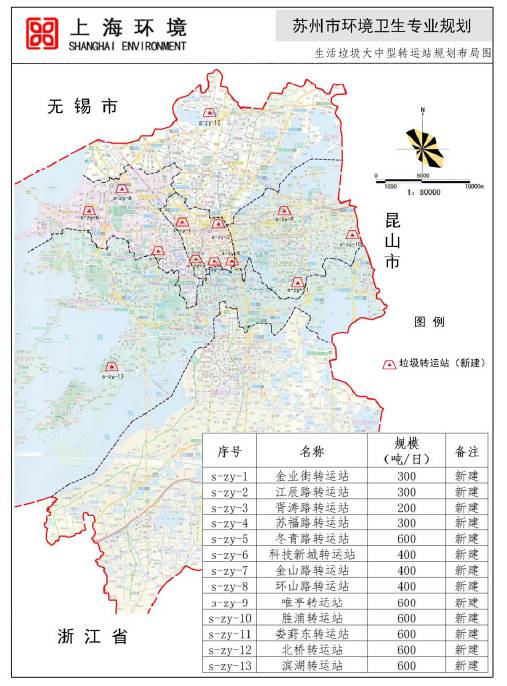 (六)大型轉(zhuǎn)運(yùn)站設(shè)置規(guī)劃:姑蘇區(qū)規(guī)劃新建5座大中型轉(zhuǎn)運(yùn)站;高新區(qū)規(guī)劃新建3座大中型轉(zhuǎn)運(yùn)站;工業(yè)園區(qū)規(guī)劃新建3座大中型轉(zhuǎn)運(yùn)站;相城區(qū)、吳中區(qū)分別新建1座大中型轉(zhuǎn)運(yùn)站。