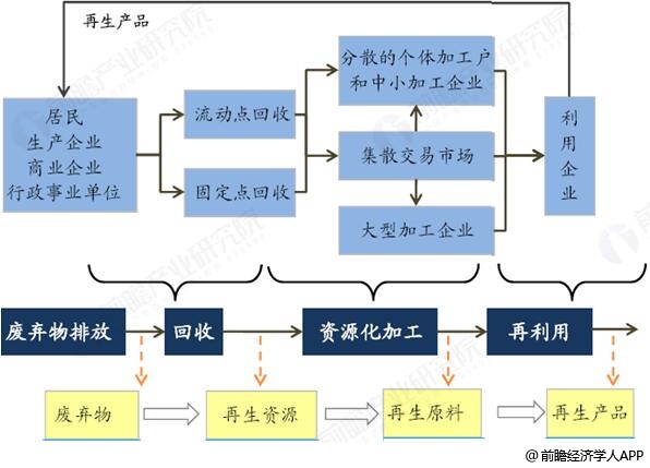 隨著再生資源市場的逐步放開,我國已形成了從產(chǎn)生源經(jīng)固定收購點、流動收購點、拾荒者、資源加工企業(yè)等層層篩選、分類,最終到達利用企業(yè)的完整流程。再生資源行業(yè)產(chǎn)業(yè)鏈主要包括廢舊資源回收、資源化加工處理和資源再利用三個環(huán)節(jié)。