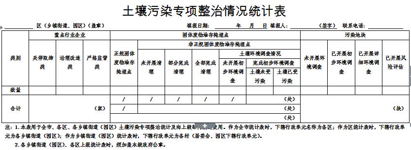 (三)嚴(yán)格執(zhí)行登記制度。各區(qū)要按照方案要求,按時(shí)完成各項(xiàng)工作,于6月30日前向市環(huán)保局報(bào)送土壤質(zhì)量與修復(fù)規(guī)劃;7月15日前向市環(huán)保局報(bào)送各類登記表(附件1);11月30日前向市環(huán)保局報(bào)送各類花名冊(cè)(附件2)和土壤污染專項(xiàng)整治情況統(tǒng)計(jì)表(附件3)。同時(shí)向市市容園林委報(bào)送涉及城鎮(zhèn)生活垃圾相關(guān)內(nèi)容,向市農(nóng)委報(bào)送涉及村莊內(nèi)生活垃圾相關(guān)內(nèi)容。