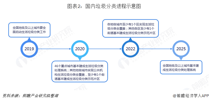 垃圾分類進(jìn)程明顯加快:2019年6月,住建部發(fā)布《關(guān)于在全國(guó)地級(jí)及以上城市全面開展生活垃圾分類工作的通知》提出,2019年起,全國(guó)地級(jí)及以上城市要全面啟動(dòng)生活垃圾分類工作;2020年底,全國(guó)46個(gè)重點(diǎn)城市要基本建成垃圾分類處理系統(tǒng);2022年前,各地級(jí)城市至少有1個(gè)區(qū)實(shí)現(xiàn)生活垃圾分類全覆蓋;2025年底前,全國(guó)地級(jí)及以上城市要基本建成垃圾分類處理系統(tǒng)。