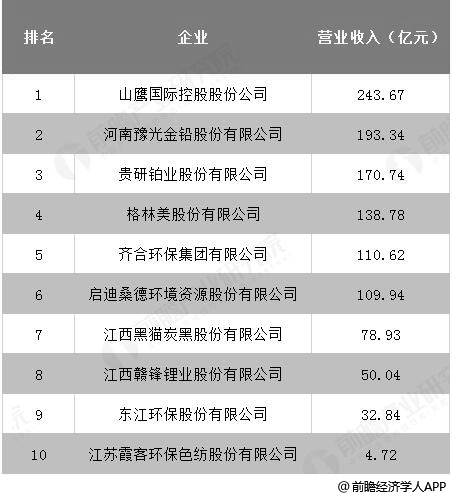 根據(jù)2018年年報數(shù)據(jù),對我國再生資源行業(yè)部分上市企業(yè)進(jìn)行整理,山鷹國際控股股份公司以243.67億元的營業(yè)收入位列其中首位;其次是河南豫光金鉛股份有限公司,實(shí)現(xiàn)營業(yè)收入193.34億元。