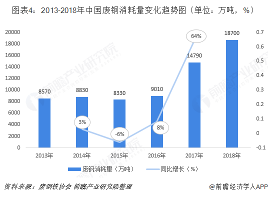 根據(jù)廢鋼協(xié)會(huì)統(tǒng)計(jì),2018年,全國(guó)廢鋼鐵資源總量為2.2億噸,同比增加2000多萬噸,增幅為10%。隨著我國(guó)鋼鐵蓄積量的逐年增多,預(yù)計(jì)2019年我國(guó)廢鋼產(chǎn)生量將會(huì)繼續(xù)提升,但增速或有放緩,廢鋼產(chǎn)生量將在2.4億噸左右。另外,2013-2017年中國(guó)廢鋼消耗逐年增長(zhǎng)。2017年中國(guó)廢鋼消耗量為14790萬噸,較上年同比增長(zhǎng)64%。2019年1月,中國(guó)廢鋼協(xié)會(huì)初步統(tǒng)計(jì),2018年中國(guó)廢鋼消耗總量達(dá)到1.87億噸??梢娢覈?guó)廢鋼鐵的利用程度逐年加深,在一定程度上減少鐵礦資源的開發(fā)利用,由此看來,發(fā)展再生資源行業(yè)對(duì)我自然資源的保護(hù)起到了積極的作用。