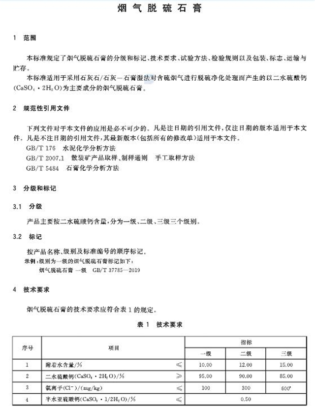 日前,國(guó)家標(biāo)準(zhǔn)委發(fā)布煙氣脫硫石膏(GB/T 37785-2019)國(guó)家標(biāo)準(zhǔn)。標(biāo)準(zhǔn)于2020年7月1日實(shí)施。標(biāo)準(zhǔn)適用于石灰石-石膏濕法對(duì)含硫煙氣進(jìn)行脫硫凈化處理而產(chǎn)生的以二水硫酸鈣為主要成分的煙氣脫硫石膏。