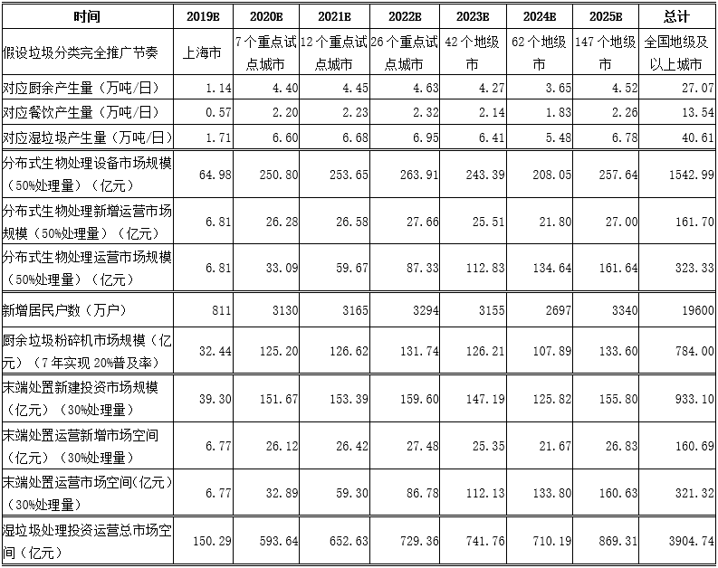 假設(shè)末端處置市場占據(jù)30%[2],前端處置市場占據(jù)70%(廚余垃圾粉碎機(jī)普及率20%[3],分布式生物設(shè)備占50%),廚余垃圾粉碎機(jī)單價(jià)2000元/臺、分布式生物設(shè)備單價(jià)38萬元/臺(0.5噸/天),推算全國地級及以上城市濕垃圾處理市場規(guī)模。經(jīng)過測算,2019-2025年我國地級及以上城市濕垃圾前端處理(廚余垃圾粉碎機(jī)和分布式生物處理設(shè)備)市場規(guī)模約為2650億元(設(shè)備+運(yùn)營),年均市場規(guī)模約379億元;末端處置市場規(guī)模約1254億元(建設(shè)+收運(yùn)+處理),年均市場規(guī)模約179億元。