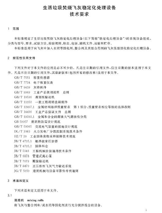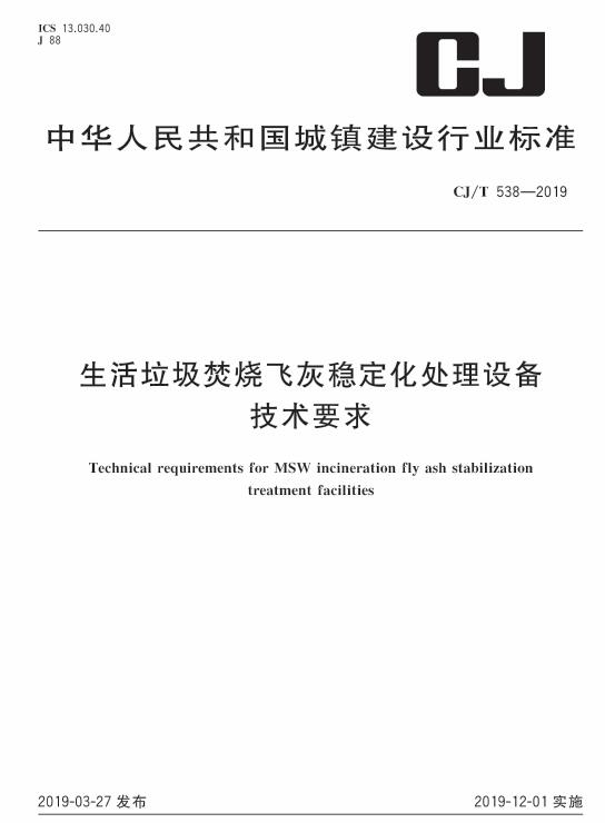 現(xiàn)批準(zhǔn)《生活垃圾焚燒飛灰穩(wěn)定化處理設(shè)備技術(shù)要求》為城鎮(zhèn)建設(shè)行業(yè)產(chǎn)品標(biāo)準(zhǔn),編號(hào)為CJ/T538-2019,自2019年12月1日起實(shí)施。