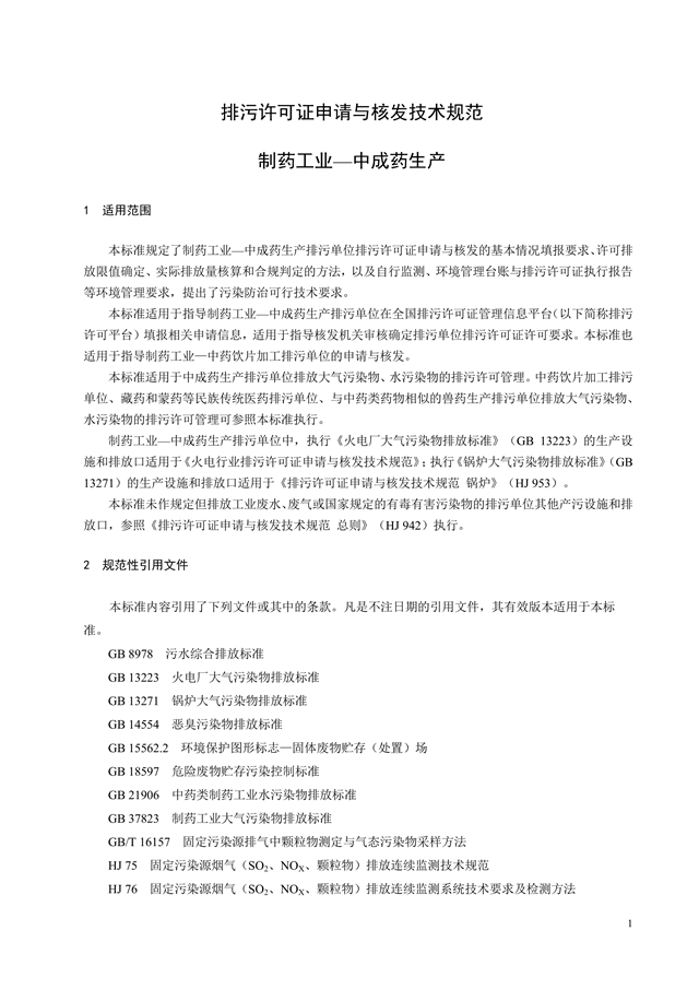 貫徹落實《中華人民共和國環(huán)境保護法》《中華人民共和國大氣污染防治法》《中華人民共和國水污染防治法》《中華人民共和國土壤污染防治法》等法律法規(guī)、《國務(wù)院辦公廳關(guān)于印發(fā)控制污染物排放許可制實施方案的通知》(國辦發(fā)﹝2016﹞81號)和《排放許可管理辦法(試行)》(環(huán)境保護部令第 48 號),完善排污許可技術(shù)支撐體系,指導(dǎo)和規(guī)范制藥工業(yè)—中成藥生產(chǎn)排污單位排污許可證申請與核發(fā)工作,制定本標(biāo)準(zhǔn)。