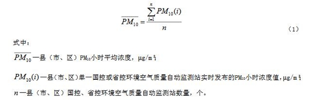3.4縣(市、區(qū))PM10小時平均濃度hourlyaverageconcentrationofPM10atthey監(jiān)控點所屬縣(市、區(qū))全部國控、省控環(huán)境空氣質(zhì)量自動監(jiān)測站實時發(fā)布的PM10小時濃度的算術(shù)平均值??h(市、區(qū))PM10小時平均濃度按式(1)計算: