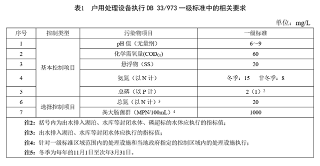 綜合考慮設(shè)施的處理規(guī)模、受納水體的環(huán)境容量、功能要求等多種因素,戶用處理設(shè)備出水直接排入GB 3838地表水Ⅱ、Ⅲ類功能水域(劃定的飲用水水源保護(hù)區(qū)和游泳區(qū)除外)、GB 3097海水二類功能水域、湖泊、水庫等封閉水域或半封閉水域時(shí),執(zhí)行DB 33/973中一級標(biāo)準(zhǔn)中的相關(guān)要求,詳見下圖: