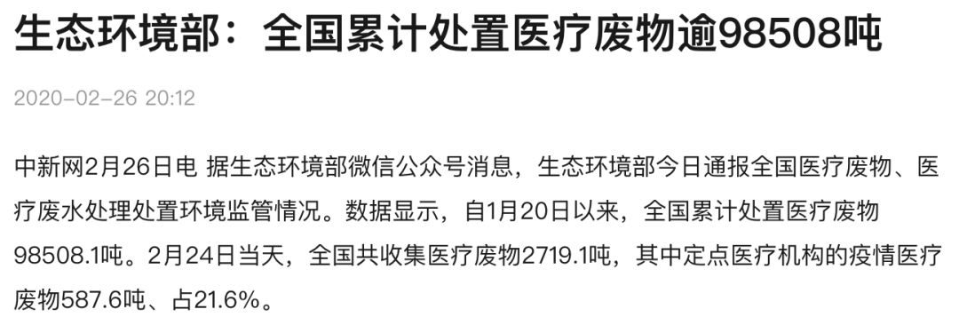 據(jù)生態(tài)環(huán)境部微信公眾號消息,自1月20日以來,全國累計處置醫(yī)療廢物已經(jīng)超過了98508噸。