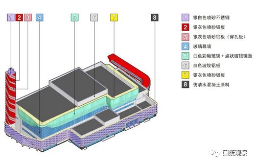 整個建筑形體如同一艘激流勇進的大舸,在“船體”部分的幕墻采用了白色彩釉玻璃+點狀鏡面鍍層的材料。點狀鏡面對天空的反射能使建筑在一定程度上融入到背景之中。