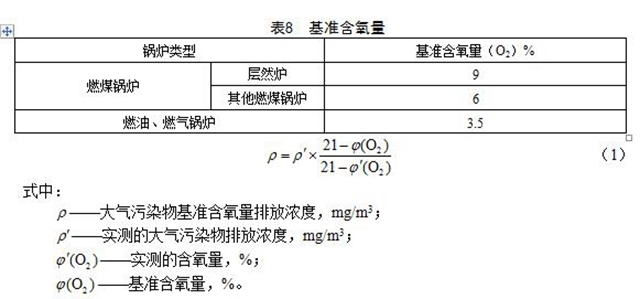 實(shí)測的鍋爐顆粒物、二氧化硫、氮氧化物、汞及其化合物的排放濃度,按公式(1)折算為基準(zhǔn)含氧量排放濃度。各類燃燒設(shè)備的基準(zhǔn)含氧量按表8規(guī)定執(zhí)行。