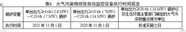 5.1.4 4t/h及以上蒸汽鍋爐、2.8MW及以上熱水鍋爐,以及生態(tài)環(huán)境主管部門確定的大氣污染物重點(diǎn)排污單位應(yīng)安裝大氣污染物排放自動(dòng)監(jiān)控設(shè)備,并與生態(tài)環(huán)境主管部門聯(lián)網(wǎng),保證設(shè)備正常運(yùn)行,執(zhí)行時(shí)間見表6規(guī)定。