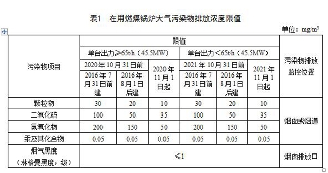 4.1 在用燃煤鍋爐執(zhí)行表1中的大氣污染物排放限值。