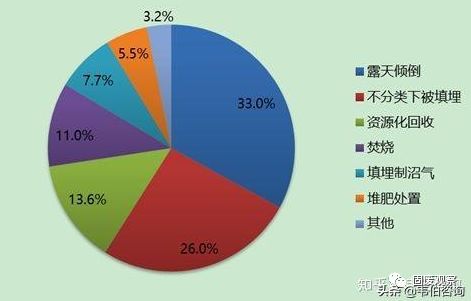 根據(jù)世界銀行報告,2016年,全球垃圾的末端處置方式有露天傾倒、填埋(不分類、沼氣化、控制)、焚燒、堆肥、資源化回收。有33%的垃圾未加處理被露天傾倒,26%的垃圾不分類下被填埋掉,7.7%的垃圾填埋制沼氣,11%的垃圾被焚燒,5.5%垃圾堆肥處置,13.6%垃圾進行了資源化回收。