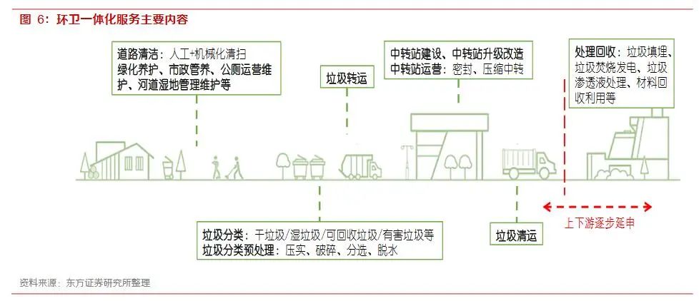 環(huán)衛(wèi)業(yè)務(wù)環(huán)節(jié)的一體化指的是服務(wù)內(nèi)容的增加以及產(chǎn)業(yè)上下游鏈條的多維度整合。具體來說,即環(huán)衛(wèi)項(xiàng)目突破傳統(tǒng)意義上的清掃保潔、垃圾清運(yùn),將清掃、保潔、中轉(zhuǎn)、收運(yùn)、處理進(jìn)行一體化打包,同時涉及垃圾分類、餐廚垃圾收運(yùn)處理、綠化養(yǎng)護(hù)、市政管養(yǎng)等內(nèi)容,隨著未來人們對生活環(huán)境要求的不斷提高,將會不斷納入新的服務(wù)項(xiàng)目。