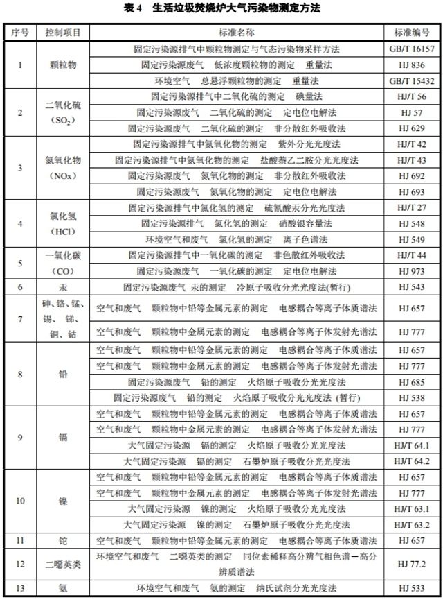 9.10 焚燒爐大氣污染物的測(cè)定方法采用表4所列的方法標(biāo)準(zhǔn)。本標(biāo)準(zhǔn)實(shí)施后國(guó)家發(fā)布的污染物監(jiān)測(cè)方法標(biāo)準(zhǔn),如適用性滿(mǎn)足要求,同樣適用于本標(biāo)準(zhǔn)相應(yīng)污染物的測(cè)定。