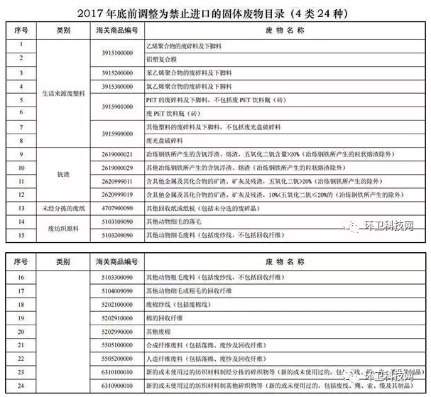 7 月 18 日,據(jù)路透社報(bào)道,中國已經(jīng)向世界貿(mào)易組織(WTO)提交了一份文件,聲明從 2017 年底開始,中國將禁止 4 類 24 種固體廢物入境,包括生活來源廢塑料、釩渣、未經(jīng)分揀的廢紙和廢紡織原料等高污染固體廢物。