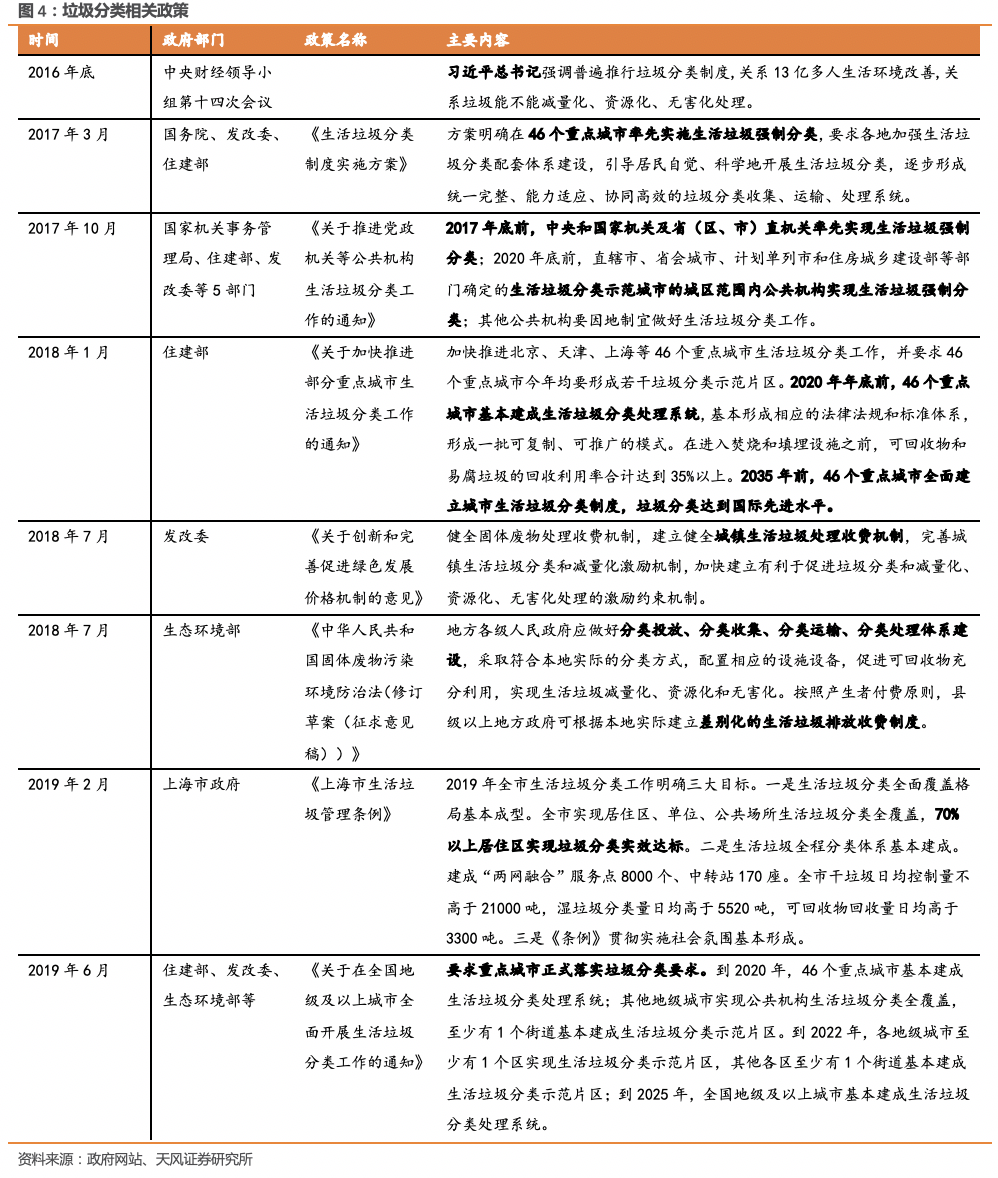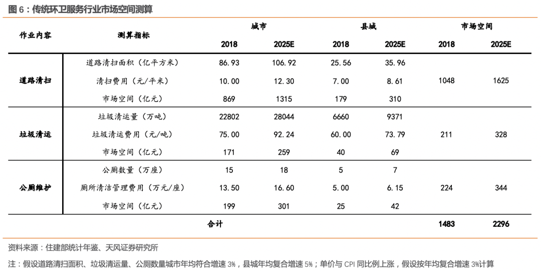 1.2. 環(huán)衛(wèi)市場化新增訂單連續(xù)兩年突破2000億元經(jīng)過2015年至今的快速推廣,全國環(huán)衛(wèi)行業(yè)新增年化訂單已經(jīng)達到550億,同比增長12%;總合同額達到2223億元,同比略降2%;平均合同期限4年,同比下降0.6年。2018-2019年連續(xù)兩年環(huán)衛(wèi)市場化新增合同總金額突破2000億元,市場化快速推廣。1.3. 本輪環(huán)衛(wèi)市場化快速推進的背后,是垃圾分類強制推動2018-2019年環(huán)衛(wèi)市場化快速推進背后的主要原因,是垃圾分類強制實施的政策催化。2016年底,習(xí)近平總書記在中央財經(jīng)領(lǐng)導(dǎo)小組第十四次會議上強調(diào)普遍推行垃圾分類制度,2017年以來垃圾分類相關(guān)細(xì)化政策不斷出臺。2019年上海市開始強制垃圾分類,深圳、北京等城市陸續(xù)跟進,垃圾分類從政策規(guī)劃真正走向落地實施。垃圾分類市場強制推進,為環(huán)衛(wèi)市場帶來新的變化。單獨的垃圾分類招標(biāo)項目增加,垃圾分類成為環(huán)衛(wèi)一體化標(biāo)配作業(yè)內(nèi)容,和環(huán)衛(wèi)服務(wù)打包招標(biāo)。1.4. 2016年以來市容環(huán)境衛(wèi)生類支出持續(xù)增加短期來看,環(huán)衛(wèi)行業(yè)的資金來源仍為財政資金城市環(huán)境衛(wèi)生支出。根據(jù)住建部統(tǒng)計年鑒,2018年我國城市、縣城、鎮(zhèn)、鄉(xiāng)、村等合計環(huán)境衛(wèi)生投資額1267億元,同比增長12.33%。2016以來市容環(huán)境衛(wèi)生類投資支出持續(xù)增加。2. 環(huán)衛(wèi)服務(wù)行業(yè)的市場空間有多大?從傳統(tǒng)環(huán)衛(wèi)向城市物業(yè)管理擴容傳統(tǒng)環(huán)衛(wèi)行業(yè)指道路清掃、垃圾清運、公廁管理等,而事實上,隨著政府簡政放權(quán),對作業(yè)效率和作業(yè)效果的標(biāo)準(zhǔn)日益提高,單位作業(yè)單價有提升空間,新的公共服務(wù)領(lǐng)域開始市場化,環(huán)衛(wèi)行業(yè)整體市場空間仍有很大擴容空間。垃圾分類、綠化養(yǎng)護、照明維護等更多內(nèi)容被納入環(huán)衛(wèi)一體化招標(biāo)訂單中,環(huán)衛(wèi)行業(yè)的內(nèi)涵日益豐富,向城市綜合管理服務(wù)邁進。2.1. 傳統(tǒng)環(huán)衛(wèi)服務(wù)市場空間近1500億元,2025年可達2300億按照最新統(tǒng)計數(shù)據(jù)進行的市場空間測算顯示,城市與縣城道路清掃、垃圾清運、公廁維護等市場空間分別為1048億、211億、224億,傳統(tǒng)意義上的環(huán)衛(wèi)服務(wù)市場空間約1483億元??紤]城鎮(zhèn)化帶來的道路面積增加、和物價上漲帶來的單價提高,預(yù)計2025年傳統(tǒng)環(huán)衛(wèi)市場空間會提高至2296億。2.2. 垃圾分類市場潛在空間800億以上,2025年可釋放近600億垃圾分類是潛在市場空間接近千億的新興市場,涉及垃圾分類設(shè)施、垃圾分選設(shè)備、垃圾分類服務(wù)、推廣宣傳、軟硬件IT服務(wù)、分類實施效果測評服務(wù)、咨詢服務(wù)等。2017年垃圾分類試點項目開始釋放,但規(guī)模普遍偏??;2018年以來,大體量垃圾分類項目開始出現(xiàn)。按照城市居民每戶20元/月,縣城居民每戶10元/月的標(biāo)準(zhǔn)進行測算,垃圾分類整體市場空間在800億以上。根據(jù)住建部的要求,全國46個城市在2020年前完成垃圾分類;到2025年,全國地級及以上城市基本建成生活垃圾分類處理系統(tǒng)。46個城市對應(yīng)居民戶數(shù)約1億戶,按照20元/戶/月測算,2020年前將釋放的市場空間約242億;全國地級以上城市約2.43億戶,到2025年垃圾分類的市場空間將達到583億。傳統(tǒng)的部門分散管理模式容易產(chǎn)生職能交叉、管理空白,管理責(zé)任機制弱化等問題,未來城市管理從分散走向綜合是發(fā)展大趨勢,可增強城市管理工作的綜合性、整體性和協(xié)調(diào)性。各地已在陸續(xù)推動部門分散管理向綜合管理轉(zhuǎn)變:- 北京已成立城市管理委員會,整合市政市容委全部職責(zé)的基礎(chǔ)上,將多個市級部門與城市運行管理相關(guān)的職責(zé)一并劃歸,比如發(fā)改委的煤、電、油、氣管理,市商務(wù)委的再生資源回收管理,市園林綠化局的城市綠化帶環(huán)境衛(wèi)生管理,市水務(wù)局的城市河湖周邊環(huán)境衛(wèi)生管理等。同時,財政預(yù)算維穩(wěn)資金和市政設(shè)施建設(shè)的統(tǒng)籌管理職責(zé),也將劃歸給城市管理委員會。