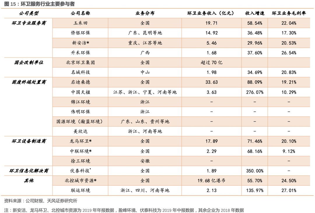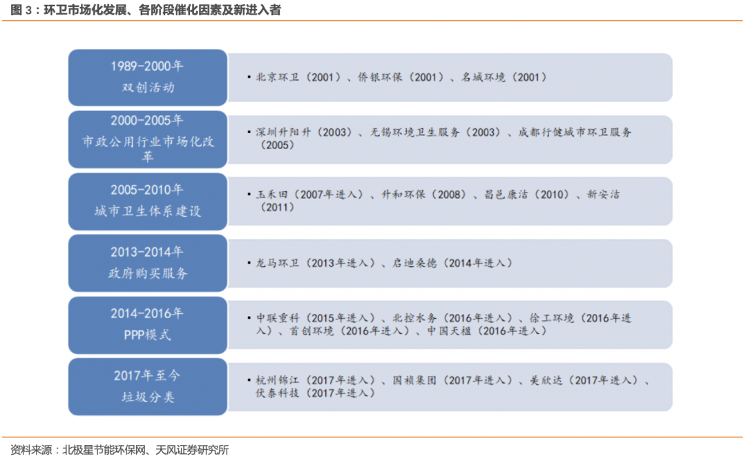 ▍環(huán)衛(wèi)行業(yè)市場化本輪加速的原因是什么?垃圾分類強制推動經(jīng)過2015年至今的快速推廣,全國環(huán)衛(wèi)行業(yè)新增年化訂單已達550億,總合同額達到2223億元,連續(xù)兩年環(huán)衛(wèi)市場化新增合同總金額突破2000億元,市場化快速推廣。2018-2019年環(huán)衛(wèi)市場化快速推進背后的主要原因,是垃圾分類強制實施的政策催化。▍環(huán)衛(wèi)服務(wù)行業(yè)的市場空間有多大?從傳統(tǒng)環(huán)衛(wèi)向城市物業(yè)管理擴容傳統(tǒng)環(huán)衛(wèi)服務(wù)市場包括道路清掃、垃圾清運、公廁維護等,預(yù)計每年運營市場空間在1500億,隨設(shè)施增加和單價上漲,預(yù)計2020年可達2300億。垃圾分類市場是潛在市場空間接近千億的新興市場,而城市服務(wù)管理是更大的潛在市場,隨著城市管理體制從分散走向綜合,環(huán)衛(wèi)一體化項目增多,綠化養(yǎng)護、照明維護等更多內(nèi)容被打包進來,環(huán)衛(wèi)企業(yè)面臨的市場空間逐步擴容。▍環(huán)衛(wèi)裝備行業(yè)的市場空間有多大?存量需求崛起根據(jù)住建部的統(tǒng)計年鑒,2018年我國城市和縣城合計的道路清掃保潔機械化率約67.68%,達到基本環(huán)衛(wèi)裝備階段?;跈C械化率提升產(chǎn)生的新增設(shè)備需求,和環(huán)衛(wèi)裝備折舊產(chǎn)生的存量替代需求,我們預(yù)測環(huán)衛(wèi)裝備存量更新需求將崛起,到2025年市場空間可達1025億/年,市場逐步釋放。▍環(huán)衛(wèi)服務(wù)的競爭格局如何?市場分散,行業(yè)集中度提升趨勢明顯環(huán)衛(wèi)服務(wù)行業(yè)參與者眾多,top5市場份額僅11.4%。目前行業(yè)內(nèi)參與者可大致分為環(huán)衛(wèi)專業(yè)服務(wù)商、國企改制單位、固廢終端處置商、環(huán)衛(wèi)設(shè)備制造商和環(huán)衛(wèi)信息化解決商等。2019年下半年以來PPP模式預(yù)期升溫,二次市場化的環(huán)衛(wèi)項目具有一定的規(guī)?;厔?,從而提高行業(yè)進入門檻,預(yù)計環(huán)衛(wèi)服務(wù)行業(yè)的集中度將獲得明顯提升。▍環(huán)衛(wèi)裝備業(yè)的發(fā)展趨勢和競爭格局將如何?客戶和產(chǎn)品結(jié)構(gòu)升級,競爭格局穩(wěn)定隨著環(huán)衛(wèi)市場化推進,裝備業(yè)的市場化客戶占比提升,裝備產(chǎn)品向新能源、智能化方向發(fā)展,TOP3市場份額約40%,行業(yè)格局將維持穩(wěn)定。我們認(rèn)為環(huán)衛(wèi)服務(wù)龍頭企業(yè)將同時受益于行業(yè)空間擴容、和市場集中度提升,建議關(guān)注【玉禾田】【僑銀環(huán)?!俊君堮R環(huán)衛(wèi)】【啟迪桑德】【北控城市資源】【盈峰環(huán)境】【中國天楹】。環(huán)衛(wèi)裝備存量需求崛起,預(yù)計行業(yè)格局維持穩(wěn)定,建議關(guān)注【盈峰環(huán)境】【龍馬環(huán)衛(wèi)】。▍風(fēng)險提示:行業(yè)競爭加劇、環(huán)衛(wèi)市場化推進慢于預(yù)期、存量裝備更新替代慢于預(yù)期1. 環(huán)衛(wèi)行業(yè)市場化本輪加速的原因是什么?垃圾分類強制推動1.1. 環(huán)衛(wèi)行業(yè)目前處于市場化快速推廣發(fā)展階段我國環(huán)衛(wèi)服務(wù)產(chǎn)業(yè)從建國以來經(jīng)歷了三個發(fā)展階段:- 政府行政職能主導(dǎo)管理階段:市政環(huán)衛(wèi)工作在政府主導(dǎo)下,由事業(yè)單位環(huán)衛(wèi)部門進行監(jiān)管、實施。直到本世紀(jì)初,事業(yè)單位仍然是絕對主體,偶爾會有一些邊緣業(yè)務(wù)交給個體性質(zhì)的組織來承擔(dān),業(yè)務(wù)規(guī)模小。