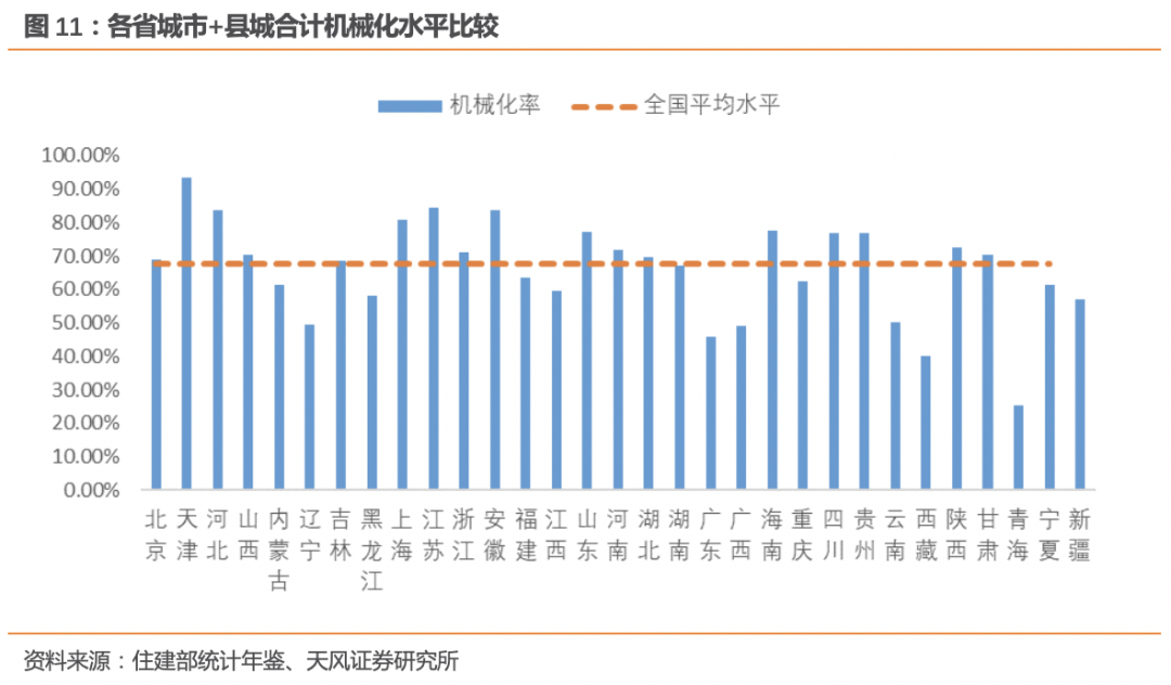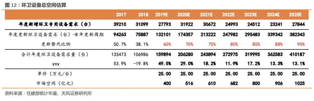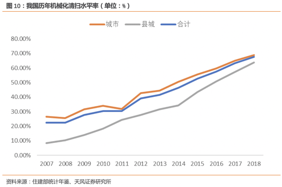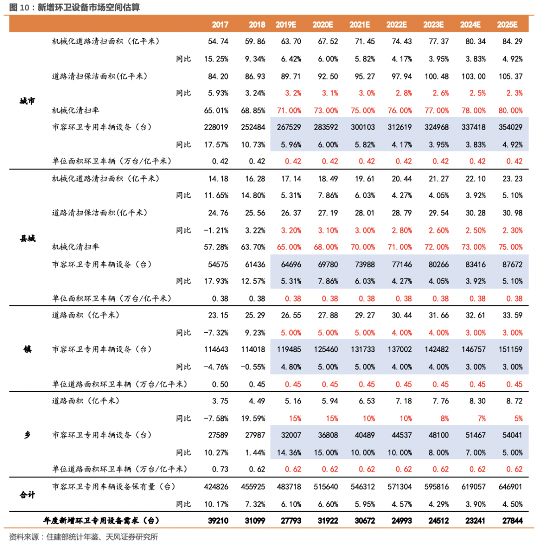 根據(jù)住建部的統(tǒng)計年鑒,2018年我國城市道路機械化率68.85%、縣城道路機械化率63.70%,城市和縣城合計的道路清掃保潔機械化率約67.68%,達到基本環(huán)衛(wèi)裝備階段。因經(jīng)濟發(fā)展水平與地域差異,不同區(qū)域間的機械化清掃水平存在差異,除省會城市和經(jīng)濟較發(fā)達地級市外,其他城市和縣城距離實現(xiàn)全面環(huán)衛(wèi)裝備階段還有差距。3.2. 機械化率存在提升空間,年度新增設(shè)備需求2-3萬臺/年根據(jù)住建部相關(guān)文件的要求,到 2020 年底前,地級及以上城市建成區(qū)道路機械化清掃率達到70%以上,縣城達到 60%以上,京津冀及周邊地區(qū)、長三角地區(qū)、汾渭平原等重點區(qū)域要顯著提高。根據(jù) 2018 年《中國城鄉(xiāng)建設(shè)統(tǒng)計年鑒》計算,2018 年我國城市道路清掃面積 86.93億平方米,機械化清掃面積 59.86億平方米,機械化清掃率為 68.85%;縣城道路清掃保潔面積 25.56億平方米,機械化清掃面積16.80億平方米,機械化清掃率僅為 63.70%。我們基于機械化率提升和單位面積環(huán)衛(wèi)車輛的假設(shè),對新增環(huán)衛(wèi)車輛市場需求進行估算,假設(shè)2019-2025年:- 城市道路清掃保潔面積年均復(fù)合增速3%左右,城市機械化率可逐步提升至80%,單位面積環(huán)衛(wèi)車輛維持0.42萬臺/億平米;