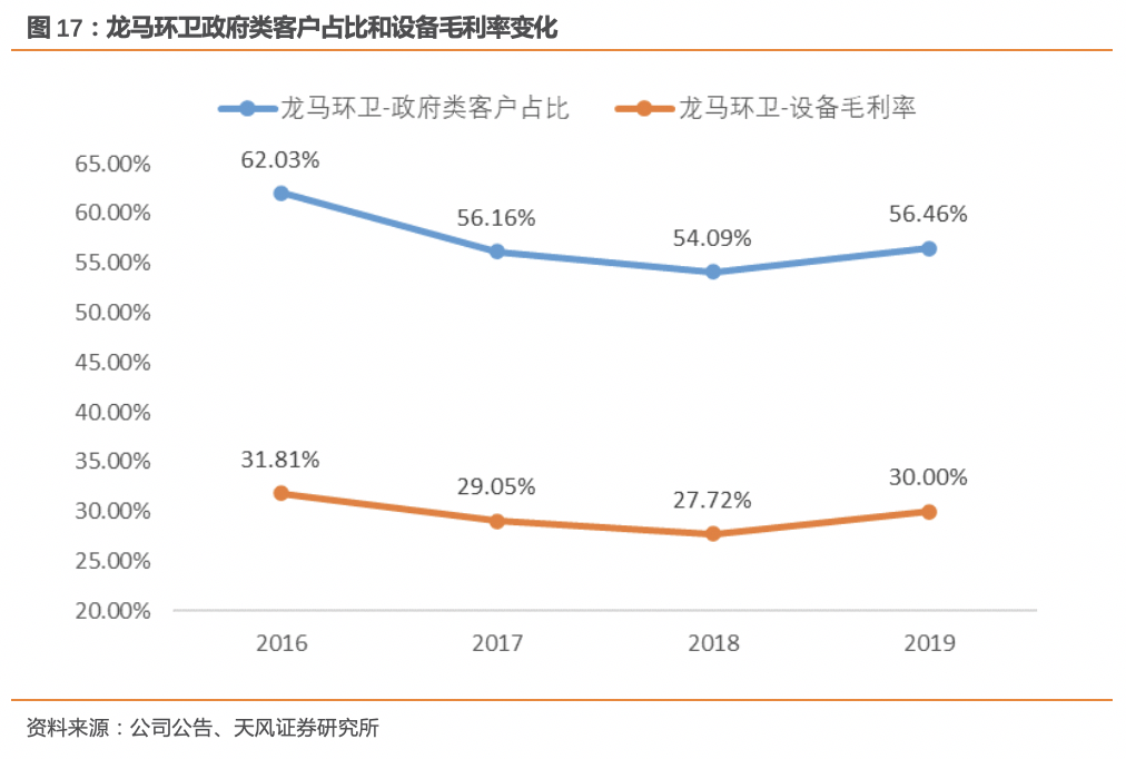 5. 環(huán)衛(wèi)裝備業(yè)的發(fā)展趨勢和競爭格局如何?客戶和產(chǎn)品結(jié)構(gòu)升級,競爭格局穩(wěn)定5.1. 客戶結(jié)構(gòu)變化:環(huán)衛(wèi)市場化推進,市場化客戶占比提升隨著環(huán)衛(wèi)市場化改革的推進,環(huán)衛(wèi)設(shè)備采購客戶類型發(fā)生顯著變化,從政府部門向市場化經(jīng)營主體轉(zhuǎn)變,需求從中高端產(chǎn)品走向高性價比的經(jīng)濟型產(chǎn)品。以龍馬環(huán)衛(wèi)為例,公司2016-2018年政府類客戶收入占比分別為62.03%、56.16%、54.09%,占比逐年下降,相應(yīng)毛利率有所下降。5.2. 產(chǎn)品結(jié)構(gòu)變化:新能源、智能化產(chǎn)品需求提升國務(wù)院發(fā)布的《打贏藍天保衛(wèi)戰(zhàn)三年行動計劃》提出,加快推進城市建成區(qū)新增和更新的環(huán)衛(wèi)等六類車輛使用新能源或清潔能源汽車,重點區(qū)域使用比例達到80%。目前各地方政府已陸續(xù)發(fā)布相關(guān)政策,新能源環(huán)衛(wèi)車輛采購量增長明顯,2019年新能源產(chǎn)品需求量同比增長148.75%。2019年新能源產(chǎn)品在環(huán)衛(wèi)產(chǎn)品市場比重約3.42%,同比上升約2個百分點,未來幾年環(huán)衛(wèi)裝備新能源化進程將進一步加快。此外,智能化產(chǎn)品逐步開始由概念到落地運營,2019年盈峰環(huán)境組建的“5G+環(huán)衛(wèi)機器人編隊”正式投入深圳市福田區(qū)福田街道清掃保潔工作,成為國內(nèi)首個落地運營的5G智能清掃環(huán)衛(wèi)PPP項目,智能設(shè)備安裝5G數(shù)據(jù)終端,基于物聯(lián)網(wǎng)進行調(diào)動和管理,并通過人工智能技術(shù)進一步提升市政環(huán)衛(wèi)作業(yè)的效率和效果。環(huán)衛(wèi)裝備行業(yè)的競爭格局相對穩(wěn)定,全國環(huán)衛(wèi)車輛生產(chǎn)企業(yè)約322家,市場參與者較多,但普遍規(guī)模較小。根據(jù)行業(yè)強制險的統(tǒng)計數(shù)據(jù),截止2019年底,年銷量超過7000臺/套只有三家,TOP3市場份額從2016年的37%上升至2019年的40%。目前我國環(huán)衛(wèi)裝備市場的主要參與者包括中聯(lián)重科、龍馬環(huán)衛(wèi)、以湖北程力為代表的湖北改裝企業(yè),以北汽福田為主的底盤廠家。另外,由于國外進口的環(huán)衛(wèi)清潔及垃圾收轉(zhuǎn)裝備的價格偏高,因此進口產(chǎn)品數(shù)量很少,國外廠商與國內(nèi)廠商的市場定位不同,難以形成直接競爭。環(huán)衛(wèi)裝備行業(yè)屬于改裝行業(yè),具有較高的技術(shù)、品牌、營銷網(wǎng)絡(luò)、售后服務(wù)、資質(zhì)及資金壁壘,對客戶需求、采購習(xí)慣具有較高的要求,行業(yè)領(lǐng)先者主要通過提高產(chǎn)品性能和技術(shù)水平、豐富產(chǎn)品種類、完善客戶服務(wù)體系等手段進行競爭。環(huán)衛(wèi)行業(yè)目前處于市場化快速發(fā)展階段,2018-2019年新增訂單已連續(xù)兩年突破2000億元,垃圾強制分類是推動本輪市場化改革的重要原因。隨著城市管理由分散走向集中,我們認(rèn)為傳統(tǒng)環(huán)衛(wèi)服務(wù)市場將不斷擴容,向城市綜合物業(yè)方向發(fā)展。目前行業(yè)集中度仍然較低,但環(huán)衛(wèi)服務(wù)二次市場化帶來的新機遇值得重視,一體化環(huán)衛(wèi)PPP項目增多,將提高行業(yè)門檻,預(yù)計行業(yè)集中度將明顯提升。我們認(rèn)為環(huán)衛(wèi)服務(wù)龍頭企業(yè)將同時受益于行業(yè)空間擴容、和市場集中度提升,建議關(guān)注【玉禾田】【僑銀環(huán)?!俊君堮R環(huán)衛(wèi)】【啟迪桑德】【北控城市資源】【盈峰環(huán)境】【中國天楹】。環(huán)衛(wèi)裝備方面,我國城鎮(zhèn)與縣城合計機械化率67.68%,達到基本環(huán)衛(wèi)裝備階段,不同區(qū)域間機械化率差別較大,預(yù)計未來存量更新需求將逐步崛起,產(chǎn)品向新能源、智能化方向發(fā)展,客戶結(jié)構(gòu)中市場化客戶占比提升,行業(yè)格局將維持穩(wěn)定,建議關(guān)注【盈峰環(huán)境】【龍馬環(huán)衛(wèi)】。行業(yè)競爭加劇、環(huán)衛(wèi)市場化推進慢于預(yù)期、存量裝備更新替代慢于預(yù)期