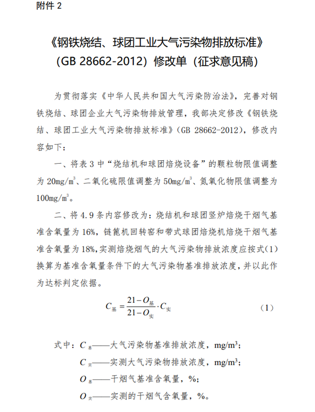 2.《鋼鐵燒結(jié)、球團(tuán)工業(yè)大氣污染物排放標(biāo)準(zhǔn)》(GB 28662-2012)修改單(征求意見(jiàn)稿)