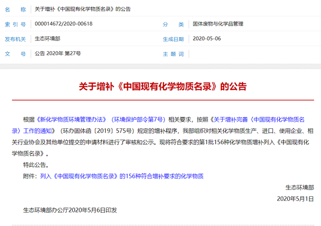 生態(tài)環(huán)境部發(fā)布關(guān)于增補(bǔ)《中國現(xiàn)有化學(xué)物質(zhì)名錄》的公告
