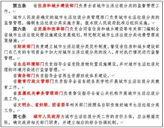 垃圾分類涉及的固體廢棄物種類多、參與主體多、全流程環(huán)節(jié)多,過(guò)去多次垃圾分類嘗試的失敗,均與主管機(jī)構(gòu)責(zé)權(quán)不清、管理邊界模糊,政府的主體監(jiān)管責(zé)任落實(shí)不到位有一定關(guān)系。此次山西省在生活垃圾分類管理規(guī)定中,開(kāi)篇明確了監(jiān)督管理、規(guī)劃設(shè)計(jì)、收費(fèi)機(jī)制、獎(jiǎng)補(bǔ)經(jīng)費(fèi)、各類垃圾處置主管單位及宣傳教育的直接責(zé)任單位,將單中心的管理模式通過(guò)清晰的分工加以細(xì)化,使得省級(jí)文件在落實(shí)過(guò)程中更具可操作性。