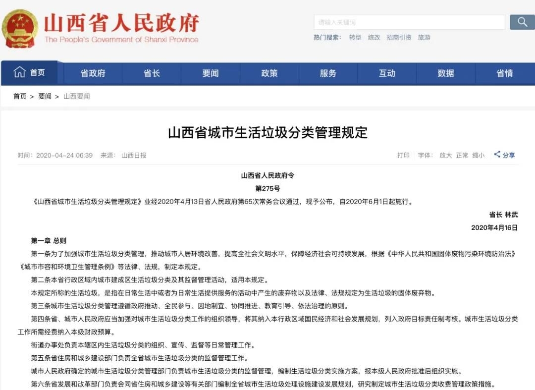 2020年4月16日,山西省人民政府第65次常務(wù)會(huì)議通過(guò)《山西省城市生活垃圾分類管理規(guī)定》自2020年6月1日起施行。生活垃圾按照: 可回收物、有害垃圾、廚余垃圾、其他垃圾進(jìn)行分類、大件垃圾和裝修垃圾單獨(dú)分類。本《規(guī)定》的出臺(tái),標(biāo)志著山西省將全域邁向生活垃圾分類管理的新階段。