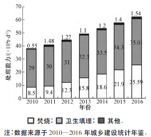 隨著人口的增加和經(jīng)濟(jì)水平的提高,我國生活垃圾產(chǎn)量逐年增加,相應(yīng)地,生活垃圾處理能力也不斷增加。2016年,我國生活垃圾處理設(shè)施共計(jì)940座,處理能力62.14萬t/d;城市生活垃圾清運(yùn)量達(dá)到2.04億t,無害化處理率為96.62%,縣城生活垃圾無害化處理率為85.22%。對(duì)我國生活垃圾處理能力進(jìn)行總結(jié),如圖1所示。