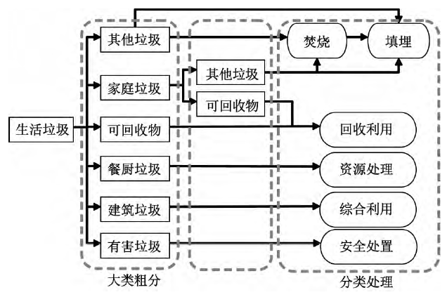 2)分類處理設(shè)施能力不足。我國大部分城市面臨處理能力跟不上垃圾增長速度的問題;此外,源頭分類后沒有相應(yīng)的處理設(shè)施,導(dǎo)致末端再次混合,造成人力浪費(fèi),并增加經(jīng)濟(jì)成本。