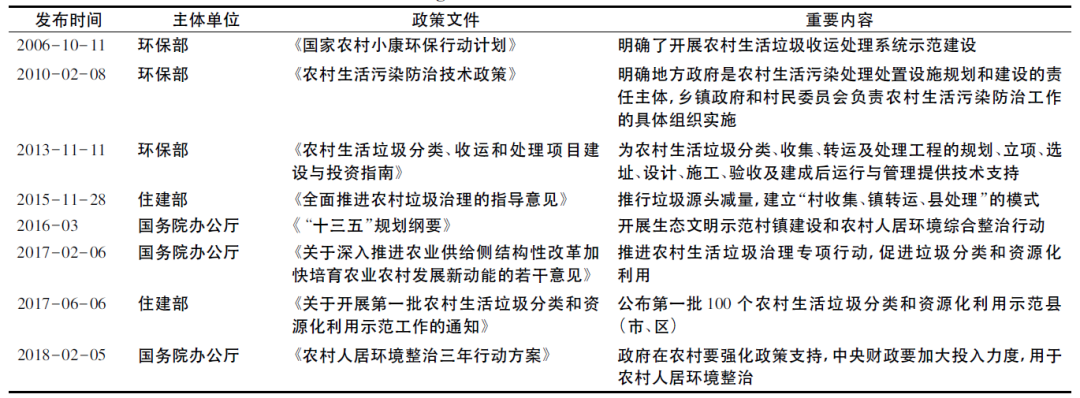 2016年12月21日,在中央財(cái)經(jīng)領(lǐng)導(dǎo)小組第十四次會(huì)議上,習(xí)近平總書記提出“要加快建立分類投放、分類收集、分類運(yùn)輸、分類處理的垃圾處理系統(tǒng),形成以法治為基礎(chǔ)、政府推動(dòng)、全民參與、城鄉(xiāng)統(tǒng)籌、因地制宜的垃圾分類制度,努力提高垃圾分類制度覆蓋范圍”。分別對(duì)近年來我國有關(guān)城市和農(nóng)村垃圾分類的主要政策進(jìn)行梳理,如表1和表2所示。