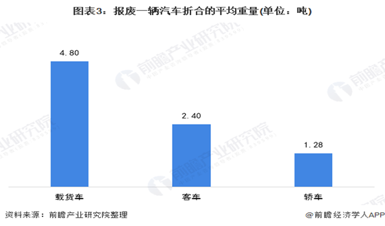 根據(jù)貨車、客車和轎車類型有所不同,平均每報廢回收一輛轎車可以回收大約1.28噸再生資源,一輛客車可回收2.40噸再生資源,一輛載貨車可以回收約4.80噸的再生資源。