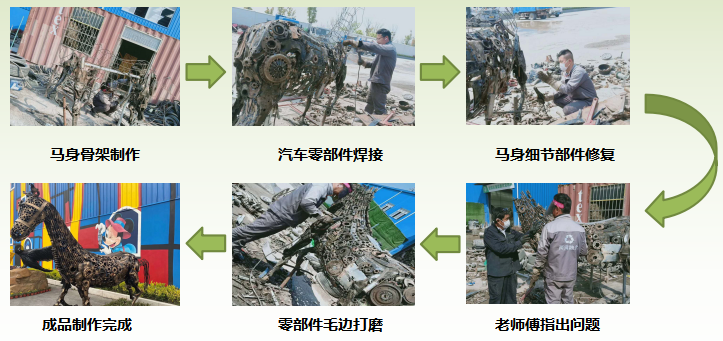 “看,這個(gè)是我們用290個(gè)飲料瓶,耗時(shí)32小時(shí)制作成的海綿寶寶;這個(gè)是用708個(gè)廢棄汽車零部件,耗時(shí)180個(gè)小時(shí)制作的一匹金色駿馬……”浦錦街道兩網(wǎng)融合中轉(zhuǎn)服務(wù)站運(yùn)營(yíng)方介紹道。而作為“門面擔(dān)當(dāng)”的變形金剛大黃蜂,則全部是利用汽車、摩托車、滅火器等的舊零部件制成,重量達(dá)400余公斤。