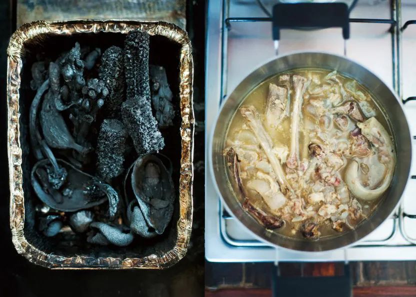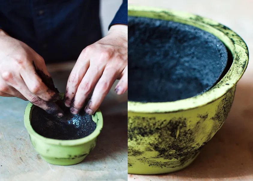 他摸索出了一套處理剩食的獨(dú)特手法:把剩菜燒成木炭,把骨頭、筋腱煮成黏膠,融合之后即可塑形,變成一套嶄新的“純天然”器皿。