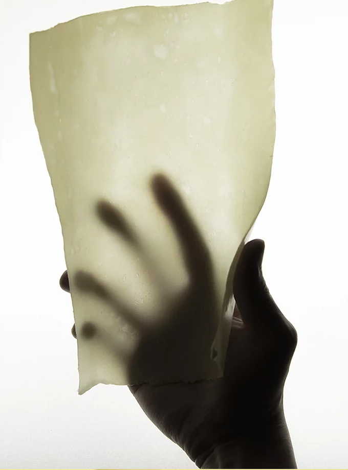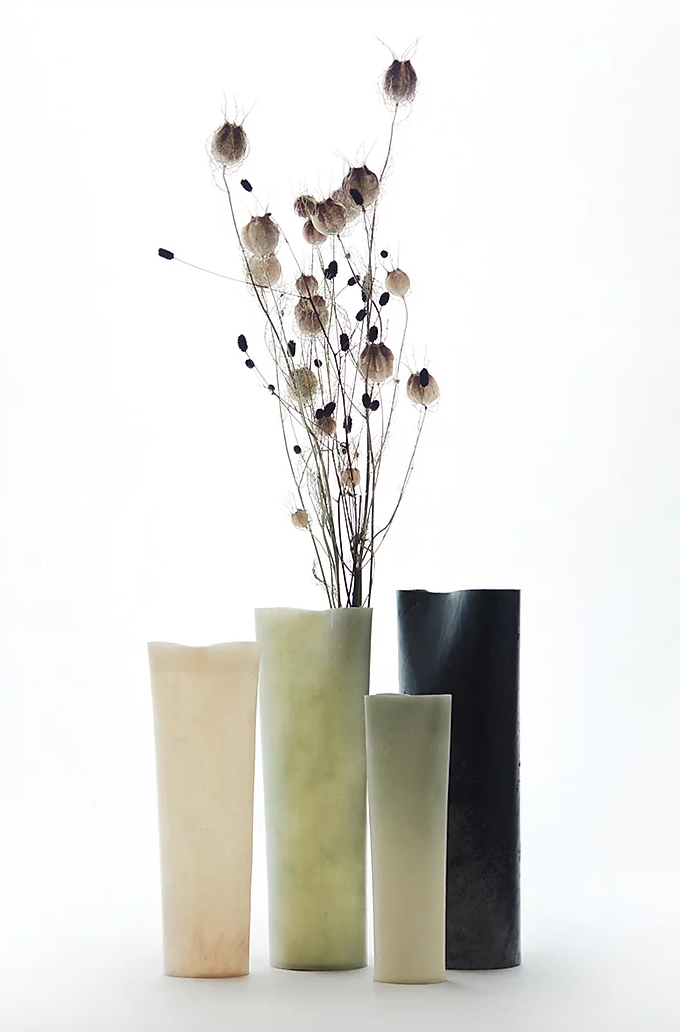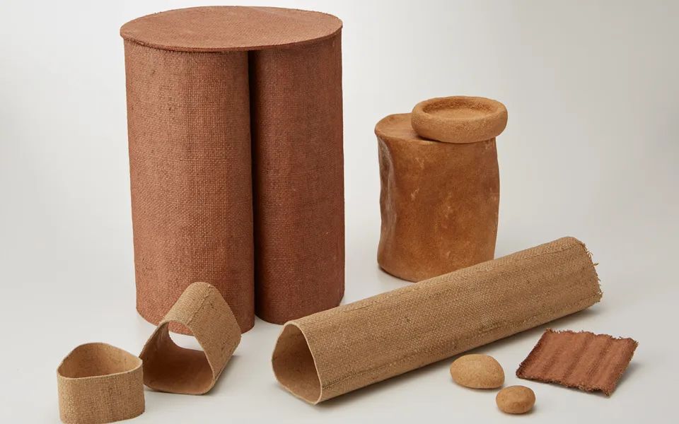 那要用什么替代塑料呢?他們發(fā)現(xiàn)了制作和菓子的主料,瓊脂,就是一個(gè)很適合的替代品。瓊脂的質(zhì)地透明多變,薄厚軟硬可以輕松調(diào)節(jié),還能夠自然降解,是一個(gè)可塑性強(qiáng)、潛力無(wú)限的材質(zhì)。瓊脂做的包裹填充物,比泡泡紙更輕盈也更有彈性,它成功保護(hù)著Araki的快遞從日本安全抵達(dá)意大利,此等優(yōu)越發(fā)明讓Araki獲得了2016年Lexus全球設(shè)計(jì)大獎(jiǎng)。此外,Araki還試著用天然的松樹(shù)脂和植物蠟,代替常見(jiàn)的亞克力材料。他設(shè)計(jì)的植脂花瓶,柔韌且防水,又比塑料更多了一份氤氳。植物材料天生有記憶屬性,在不同的溫度控制下,很容易用手工塑形,讓這些花器有了流水線產(chǎn)品缺少的溫度。而作為大米消費(fèi)大國(guó),日本每年都有成噸的大米囤積發(fā)霉變質(zhì)。Araki借鑒日本歷史上,用大米制成膠水穩(wěn)固房屋的案例,他用大米膠水粘合木屑和黃麻,制成強(qiáng)韌的圓柱體。