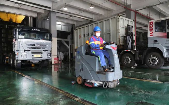 工作人員駕駛清潔車(chē)在上海城投環(huán)境集團(tuán)徐浦基地裝運(yùn)車(chē)間內(nèi)工作(6月22日攝)。新華社記者 方喆 攝
