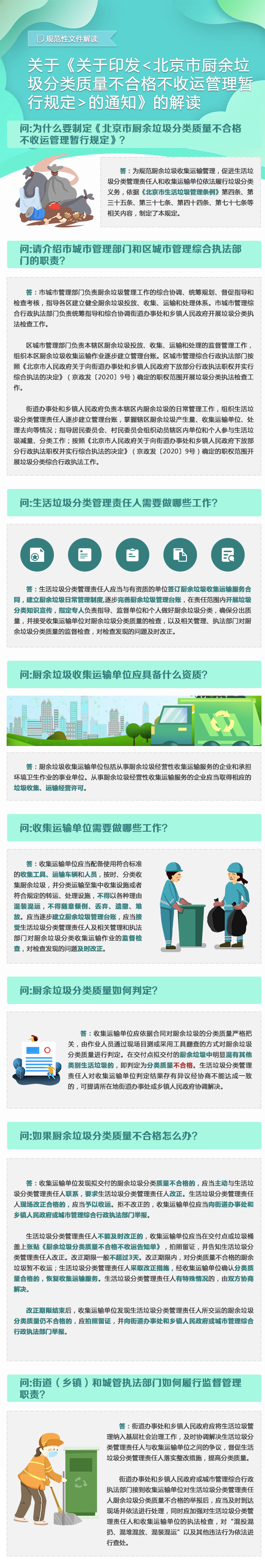 第一條 為規(guī)范廚余垃圾收集運(yùn)輸管理,促進(jìn)生活垃圾分類管理責(zé)任人和收集運(yùn)輸單位依法履行垃圾分類義務(wù),依據(jù)《北京市生活垃圾管理?xiàng)l例》,制定本規(guī)定。