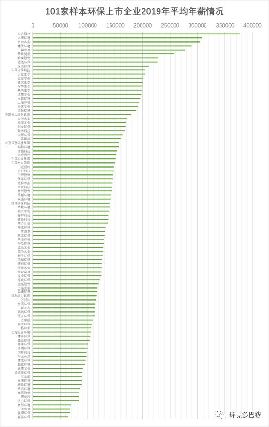 個(gè)人認(rèn)為這是兩個(gè)正面因素和一個(gè)負(fù)面因素的疊加。兩個(gè)正面因素一為,行業(yè)中出現(xiàn)了一些對(duì)高端人才更具吸引力的非環(huán)保上市企業(yè)組織,如長(zhǎng)江環(huán)保集團(tuán)、江蘇環(huán)保產(chǎn)業(yè)集團(tuán)、布局環(huán)保的大國(guó)企央企等。二為,積累了足夠資源跳出環(huán)保上市公司轉(zhuǎn)而創(chuàng)業(yè)的人群。這部分人數(shù)難以客觀統(tǒng)計(jì),但相信諸位的圈子里一定就有這兩年跳出來(lái)創(chuàng)業(yè)的朋友,總數(shù)應(yīng)該也不少。負(fù)面因素為,數(shù)量不少環(huán)保上市企業(yè)內(nèi)部實(shí)實(shí)在在的變化真的讓一些人或主動(dòng)或被動(dòng)選擇離開(kāi),甚至轉(zhuǎn)行,這也是無(wú)法回避的事實(shí)。終于要討論到收入了,直奔主題:環(huán)保上市公司的薪酬情況如何?本文整理了101家樣本環(huán)保上市公司(在前文人員工統(tǒng)計(jì)分析102家樣本基礎(chǔ)上再次剔除異常值“科林環(huán)保”)的薪資支付現(xiàn)金流數(shù)據(jù),即年報(bào)現(xiàn)金流量表“支付給職工以及為職工支付的現(xiàn)金”科目。(注:支付給職工以及為職工支付的現(xiàn)金主要包括——本期實(shí)際支付給職工的工資、獎(jiǎng)金、各種津貼和補(bǔ)貼等;以及為職工支付的養(yǎng)老、失業(yè)等社會(huì)保險(xiǎn)基金、補(bǔ)充養(yǎng)老保險(xiǎn)、企業(yè)為職工支付的商業(yè)保險(xiǎn)金、住房公積金、支付給職工的住房困難補(bǔ)助,以及企業(yè)支付給職工或?yàn)槁毠ぶЦ兜母@M(fèi)用等)將結(jié)果與員工人數(shù)相除,得到企業(yè)薪酬圖表。