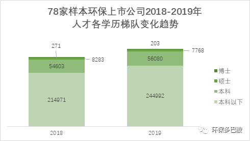 答案似乎是否定的。根據(jù)上市公司年報(bào),2019年102家環(huán)保企業(yè)(統(tǒng)計(jì)口徑已在數(shù)據(jù)圖表中說(shuō)明)員工總數(shù)為40.7萬(wàn)人,較2018年增長(zhǎng)10.5%。換言之,至少在上市公司這一環(huán)保產(chǎn)業(yè)中流砥柱群體,2019年的環(huán)保從業(yè)者總數(shù)并未因產(chǎn)業(yè)的波動(dòng)而出現(xiàn)下降。但這個(gè)數(shù)據(jù)背后并非沒(méi)有隱憂。首先,雖然行業(yè)整體從業(yè)員工總數(shù)增長(zhǎng),但2019年員工數(shù)減少的企業(yè)依然占了3成——33家。其次,3.9萬(wàn)人的凈增長(zhǎng)人數(shù),超過(guò)一半來(lái)自于僑銀環(huán)保這一家環(huán)衛(wèi)企業(yè)(注:由于是新IPO企業(yè),2018年員工數(shù)據(jù)使用的是招股說(shuō)明書中2018年6月30日的數(shù)據(jù))。除開(kāi)僑銀環(huán)保,101家環(huán)保上市公司2019年員工數(shù)增長(zhǎng)不超過(guò)5%。和數(shù)量同樣重要的是質(zhì)量。A股上市公司年報(bào)中一般有針對(duì)員工群體學(xué)歷層次的詳細(xì)數(shù)據(jù)——這也是我們進(jìn)一步分析環(huán)保企業(yè)人才結(jié)構(gòu)和變化趨勢(shì)的最好材料。這部分我們統(tǒng)計(jì)了有相關(guān)數(shù)據(jù)披露的78家環(huán)保上市公司數(shù)據(jù)(排除中國(guó)天楹的全部A股上市環(huán)保公司,包括盛運(yùn)環(huán)保和有相關(guān)數(shù)據(jù)披露的港股綠色動(dòng)力環(huán)保),得到的結(jié)果如下。顯而易見(jiàn),上述環(huán)保從業(yè)者總數(shù)增長(zhǎng)的結(jié)果主要來(lái)自本科以下的從業(yè)群體。所謂“高素質(zhì)人才”隊(duì)伍中,僅有本科員工有2.7%的增長(zhǎng)。而碩博數(shù)都有所下降,特別是博士群體,人數(shù)直接減少了四分之一。
