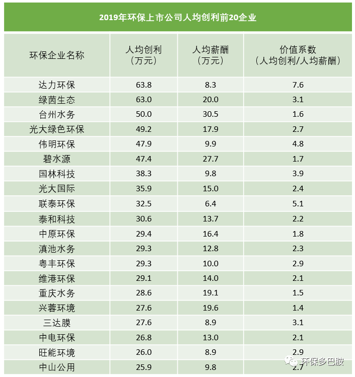 多就是多,少就是少,在此沒(méi)有必要對(duì)個(gè)別企業(yè)作單獨(dú)展開(kāi)。咱說(shuō)說(shuō)整體情況,2019年,百余家環(huán)保上市公司為超過(guò)40萬(wàn)員工支付的薪酬為464.8億元,平均年薪為11.41萬(wàn)元,較2018年增長(zhǎng)了1.84萬(wàn)元。聽(tīng)起來(lái)還不錯(cuò),但注意這是企業(yè)端的薪金成本,并非員工到手的收入,不精細(xì)地推算,對(duì)應(yīng)員工平均月薪為稅前8300元。智聯(lián)招聘針對(duì)2019年冬季求職行業(yè)平均薪酬的調(diào)查數(shù)據(jù)顯示環(huán)保行業(yè)平均薪酬為8070元。將本文研究對(duì)象為水準(zhǔn)偏高的環(huán)保上市公司這一因素考慮在內(nèi),兩個(gè)結(jié)果實(shí)際是高度吻合的。做環(huán)保的企業(yè),哪家還沒(méi)個(gè)Big Dream?當(dāng)下的收入重要,未來(lái)的錢景,也即收入的增長(zhǎng)勢(shì)頭也同樣重要。為此,我將2019年平均薪資增長(zhǎng)率前20位的環(huán)保上市公司摘出,得到如下結(jié)果: