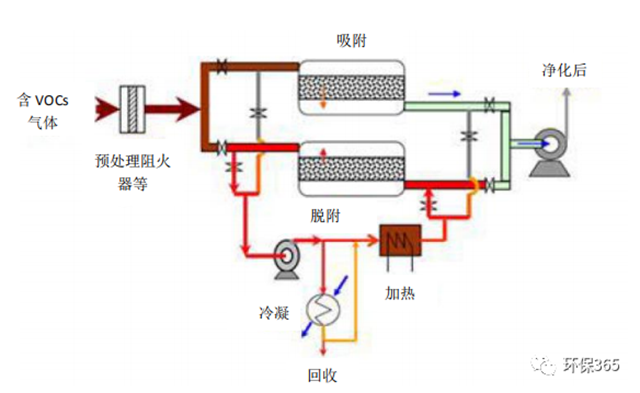 該技術(shù)采用多級冷凝技術(shù),使廢氣的有機(jī)成分在常壓下凝結(jié)成液體析出,經(jīng)凈化后的廢氣進(jìn)入吸附器進(jìn)一步吸附富集,同時(shí)確保達(dá)標(biāo)排放。吸附飽和后的吸附劑(活性炭、沸石等)等采用負(fù)壓脫附方式再生吸附劑,并將高濃度 VOCs 送回前端冷凝裝置。