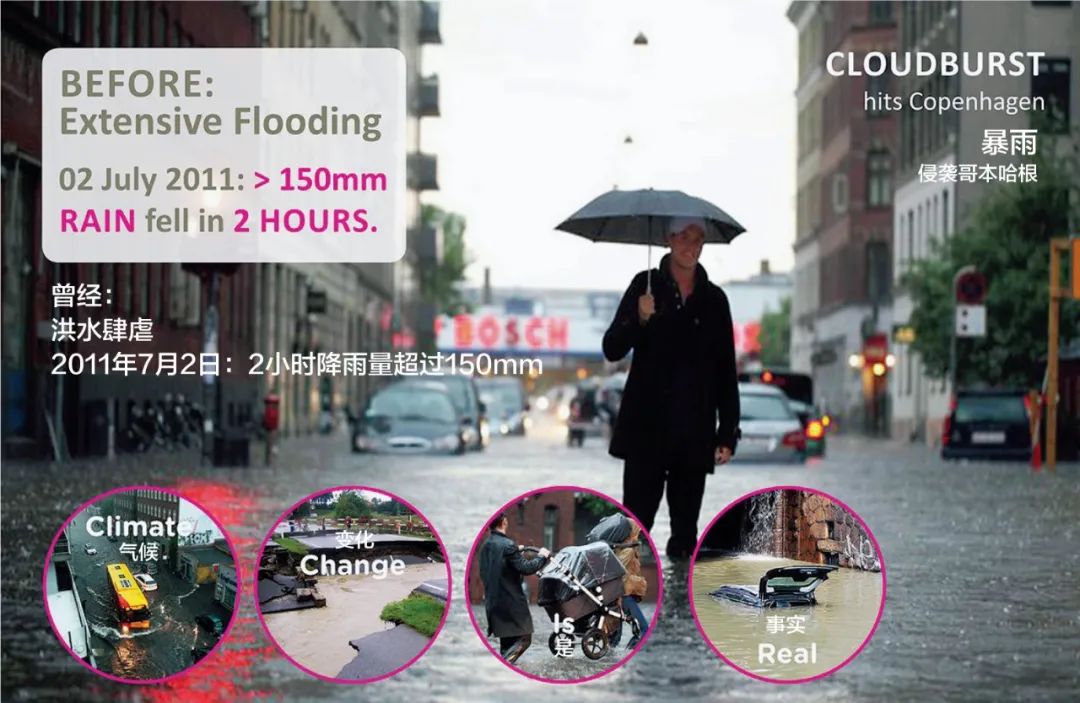 2010年8月與2011年8月,哥本哈根市在兩年內(nèi)接連遭受了三次毀滅性的暴雨襲擊。從統(tǒng)計數(shù)據(jù)看,三次暴雨均為百年一遇的極端降水事件,盡管理論上它們在12個月內(nèi)連續(xù)發(fā)生的概率極低。然而,統(tǒng)計數(shù)據(jù)是一回事,現(xiàn)實卻是另一回事。這些暴雨災害也許正是氣候變化為現(xiàn)代城市敲響的警鐘。在這些暴雨事件中,哥本哈根不可計數(shù)的高速公路、主干道、列車軌道和其他基礎(chǔ)設(shè)施被淹沒在洪水中,同樣被淹的還有大量的商店與住宅。這三次特大暴雨所造成的經(jīng)濟損失累計達到80億元人民幣。