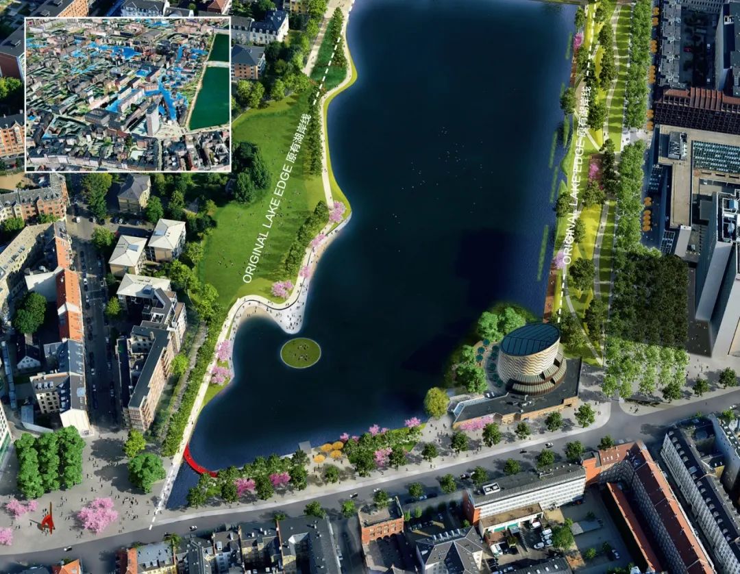 我們的具體策略之一是雨水滯留公園,這是我們的海綿城市“暴雨防控方案”中的一個關(guān)鍵要素。眾所周知,景色怡人的“藍綠公園”能夠為居民健康帶來巨大裨益,而經(jīng)過設(shè)計,這些公園也可以成為吸納特大洪水的“海綿”。該規(guī)劃充分利用哥本哈根市區(qū)三大內(nèi)湖之一的圣約爾根湖,通過將湖水水位由5.8m降低到2.8m,使其成為一座風景秀美的湖濱公園。在提升城市休閑娛樂價值的同時,海綿城市設(shè)計也為城市創(chuàng)造出一大片雨水集蓄區(qū)。而傳統(tǒng)的工程設(shè)計方式則只能通過建造巨型的、造價高昂的泄洪道或管網(wǎng)來傳輸雨水——而鑒于大型暴雨事件十分罕見,這些設(shè)施在絕大多數(shù)情況下都將處于閑置狀態(tài)。與埋設(shè)地下雨洪排水管的工程造價相比,建造于地上的圣約爾根湖方案將節(jié)省大約10億元人民幣。通過這一看似簡單的景觀設(shè)計策略,安博實現(xiàn)了以遠低于傳統(tǒng)水泥蓄水池的成本來建造巨型蓄水設(shè)施的目標。更為重要的是,人們可以走進我們新建的藍綠公園,享受閑暇與歡愉。