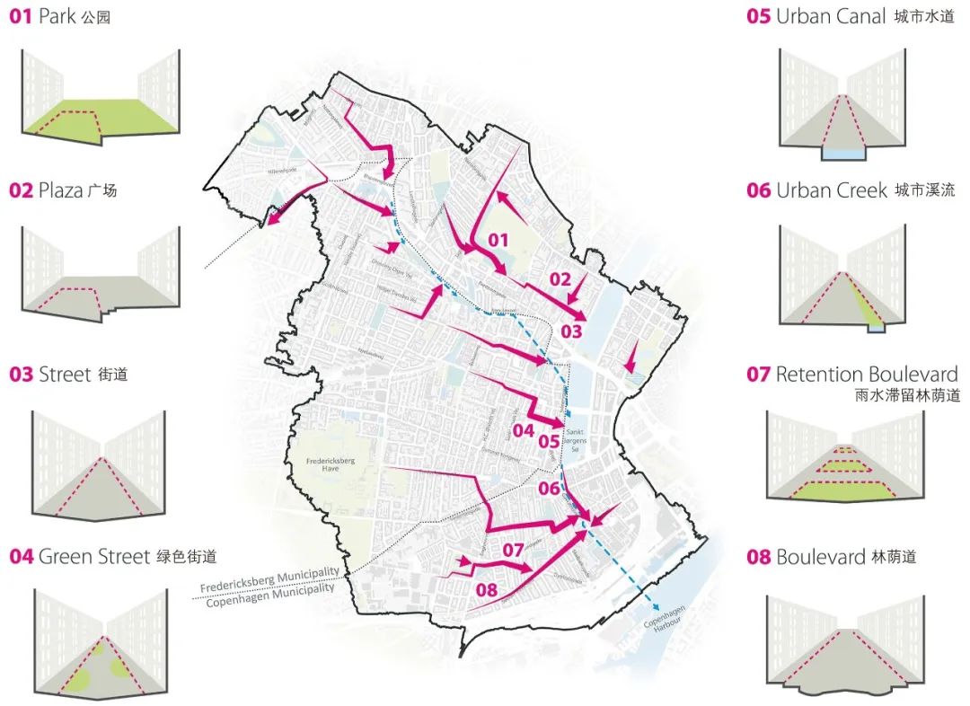整合后的規(guī)劃將為城市帶來諸多額外效益。隨著對總體規(guī)劃愿景的細化,哥本哈根城區(qū)被分為8個區(qū)域,每個區(qū)域作為一個獨立的集水區(qū),均需要更為細致的具體規(guī)劃方案。安博負責其中4個區(qū)域的具體實施方案設(shè)計,其中包括暴雨街道、雨水滯留街道、綠色街道的具體設(shè)計,及如何通過這些方案實現(xiàn)提升城市宜居性的總體目標。